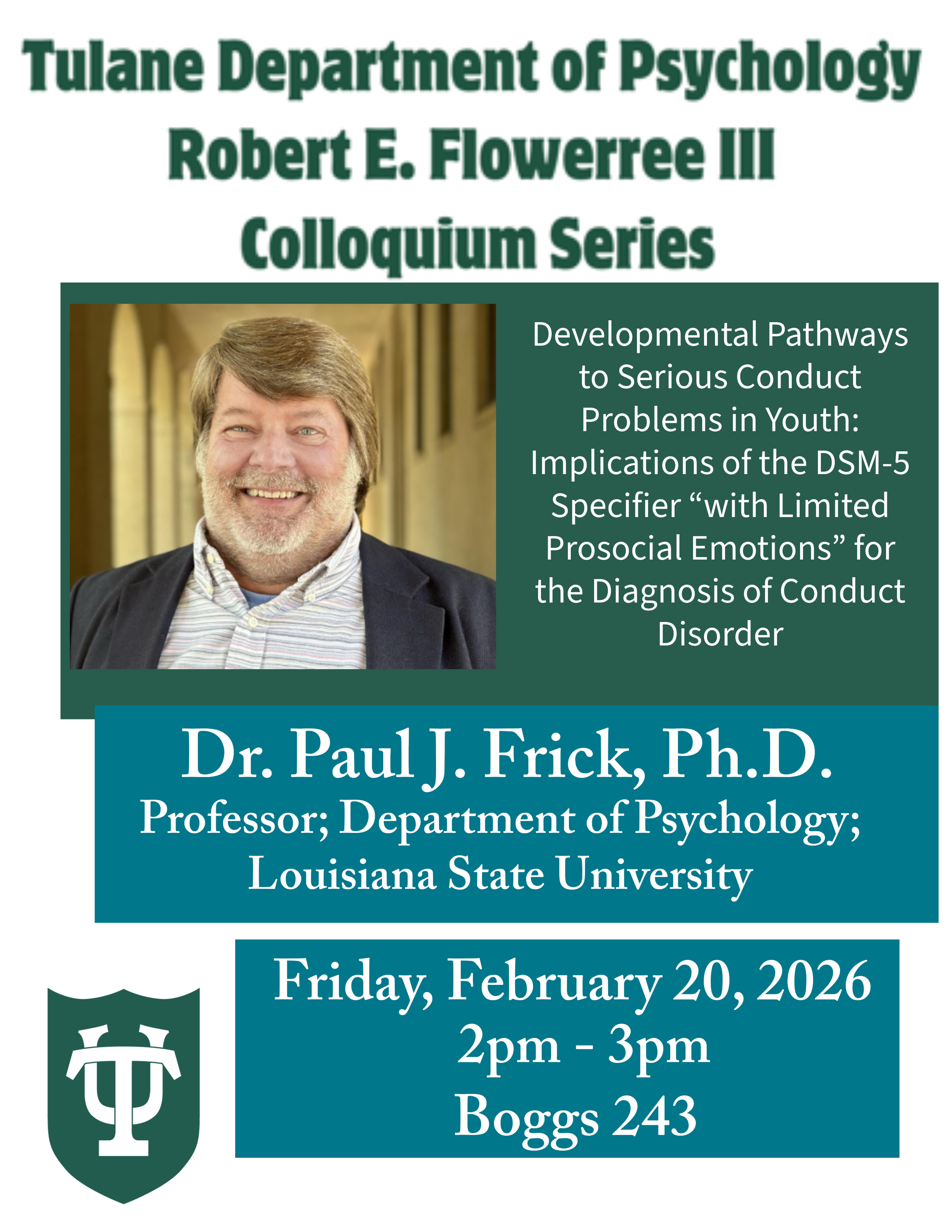 02/20/26 - Dr. Zeytinoglu hosted Dr. Paul Frick, who is an Endowed Professor at Louisiana State University-Baton Rouse. Dr. Frick gave a talk in the Psychology Colloquium focusing on the developmental pathways linking callous unemotional traits with conduct disorders.